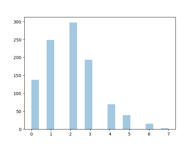 sns.distplot(random.poisson(lam=2, size=1000), kde=False)